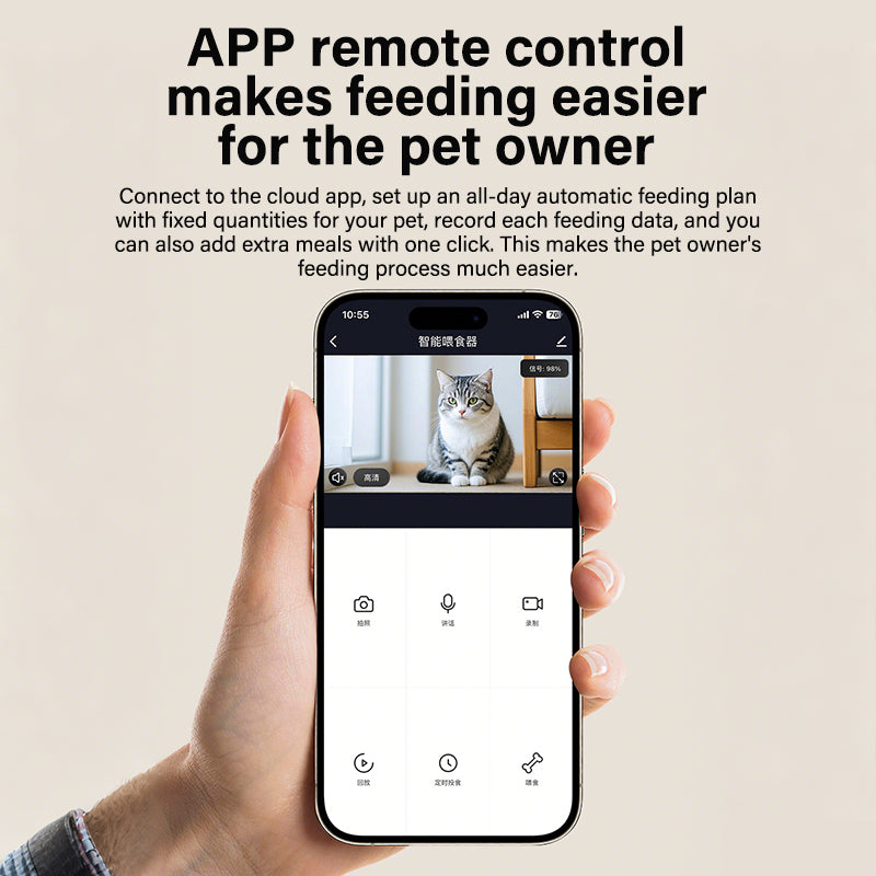 - Supports scheduled dispensing of up to 6 meals per day, app-based parameter setting, and manual release when needed.