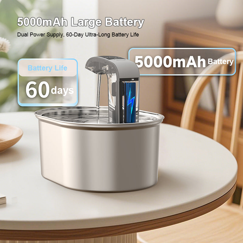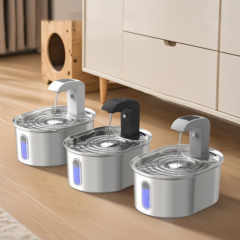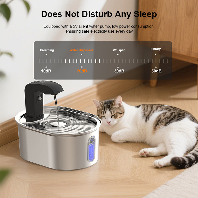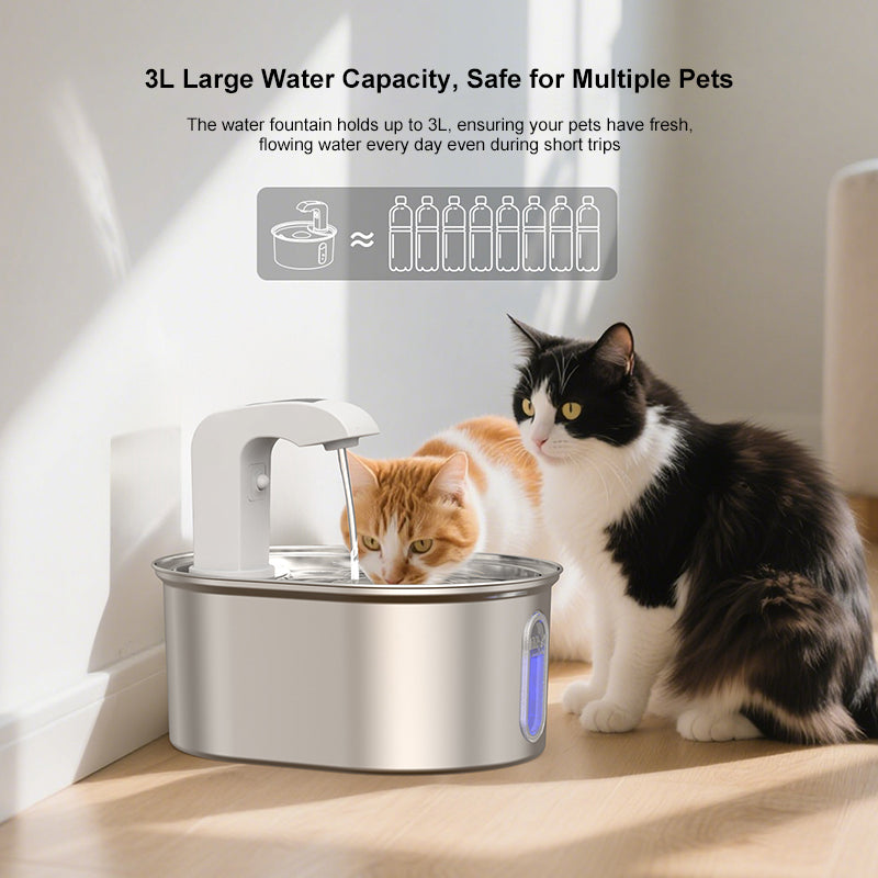304 stainless steel pet water fountain with triple-layer filtration and an ultra-quiet pump under 35dB. Provides fresh, filtered water for your pets.